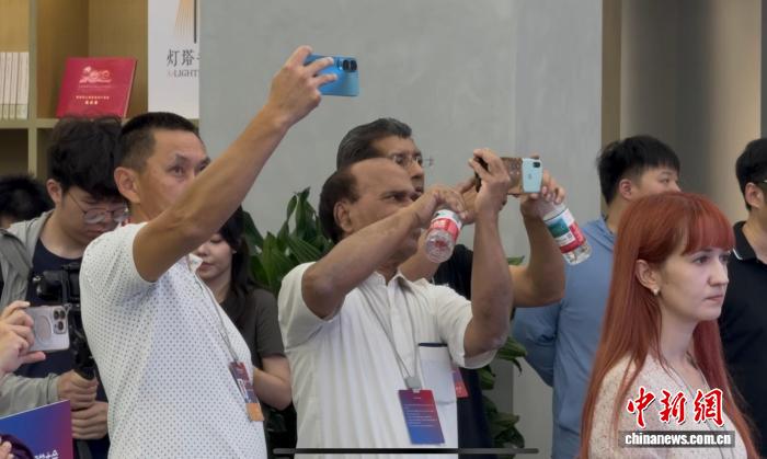 10月13日下午,多国中国学专家在上海徐汇滨江党群服务中心听讲介绍时拍照。娄瀚锟摄