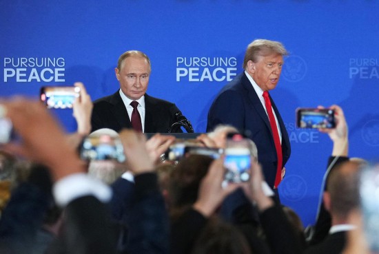 8月15日,美国总统特朗普(后右)与俄罗斯总统普京(后左)在美国阿拉斯加州安克雷奇市埃尔门多夫-理查森联合军事基地举行会晤后共同出席联合记者会。新华社记者吴晓凌摄