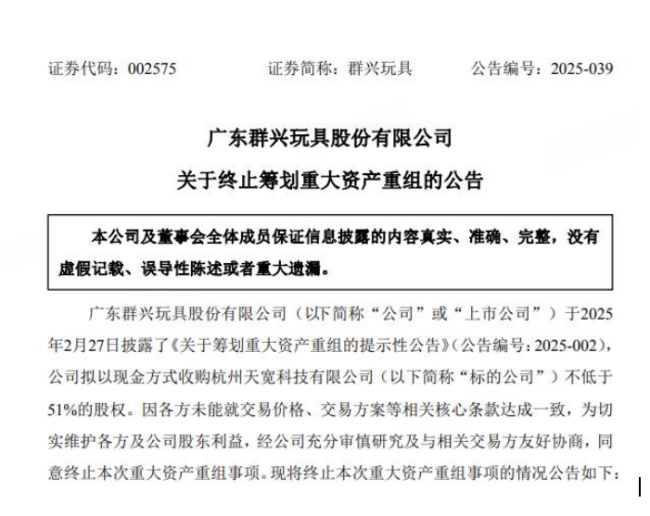 公告显示,2025年2月25日,群兴玩具与天宽科技股东浙江松萌信息技术有限责任公司、杭州承宽投资管理合伙企业(有限合伙)、卢晓飞、徐宏、卢瑞林签署了《股权收购框架协议》,拟以现金方式收购上述股东合计持有的天宽科技不低于51%的股权。若交易完成,天宽科技将成为群兴玩具的控股子公司。经初步测算,该交易预计构成重大资产重组,但不构成关联交易,不涉及上市公司发行股份,也不会导致上市公司控股股东和实际控制人发生变更。