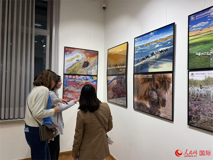 布鲁塞尔的秋日午后,马头琴曲《天边》的悠扬旋律在文化中心大厅回荡,与展厅内的影像画面交相辉映。浑厚悠长的《苍天般的阿拉善》乐声,映衬着巴丹吉林沙漠的全景图片,令人仿佛置身大漠深处。提前到场的嘉宾们饶有兴致地翻阅文旅手册与遗产保护资料,对这片来自中国北疆的神奇土地充满好奇与期待。