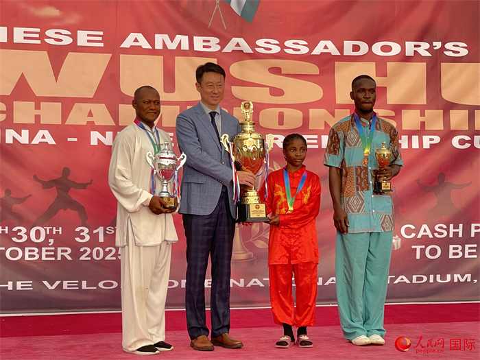 人民网阿布贾11月1日电 (记者姜宣)10月31日,“中国大使杯”尼日利亚武术锦标赛决赛在阿布贾国家体育馆举行。本次活动由中国驻尼日利亚大使馆和尼日利亚国家体育委员会联合主办,尼日利亚中国文化中心和阿布贾武术协会联合承办。中国驻尼日利亚大使于敦海,尼日利亚国家体育委员会主席谢胡、总干事布科拉出席决赛活动并致辞,尼日利亚中国文化中心主任杨建兴参赞,尼日利亚联邦首都区社会发展秘书处常秘奥卢布米,及尼日利亚多个文化体育机构嘉宾、多所学校师生、在尼中资企业代表等逾千人参加了活动。