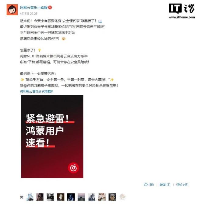 今年4月,“网易云音乐小客服”官方小红书账号发布提醒,称鸿蒙系统中能用的网易云音乐平替版存在风险。据可靠消息,这些软件不仅偷偷调用接口,还疑似藏有木马病毒,可能导致账号被他人操控或个人信息泄露。因此,用户需警惕所有非官方版本的网易云音乐应用。