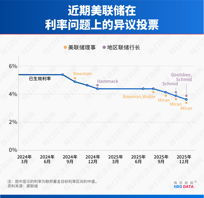 尽管如此,FOMC内部的分歧依然显著。本次降息25个基点的决定中,9人投票赞成,3人投反对票。美联储理事斯蒂芬·米兰主张进行更大幅度的50个基点降息;堪萨斯城联储主席杰弗里·施密德和芝加哥联储主席奥斯坦·古尔斯比则认为应维持利率不变。