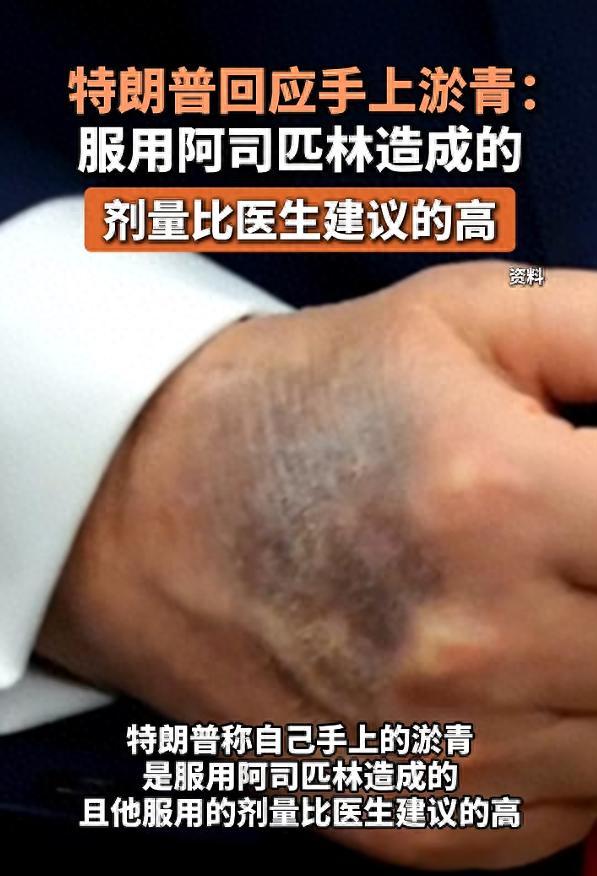 特朗普解释说,阿司匹林有助于稀释血液,他希望清澈的血液畅通地流过心脏,因此选择服用更大剂量。此前,特朗普曾多次被拍到手上有淤青。2025年7月,白宫新闻秘书莱维特表示,这些淤青是他经常握手导致的。