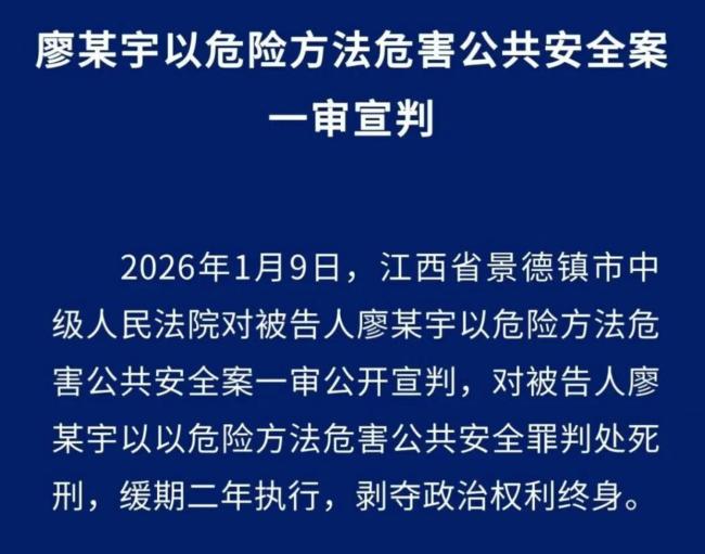 1月9日,景德镇中院对“景德镇一家三口被撞身亡案”进行了宣判。被告人廖某宇因以危险方法危害公共安全罪被判处死刑,缓期二年执行,剥夺政治权利终身。
