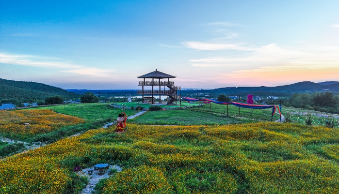 伊庄镇吕梁花海漫山铺金,观景台揽尽湖光山色。孙井贤摄