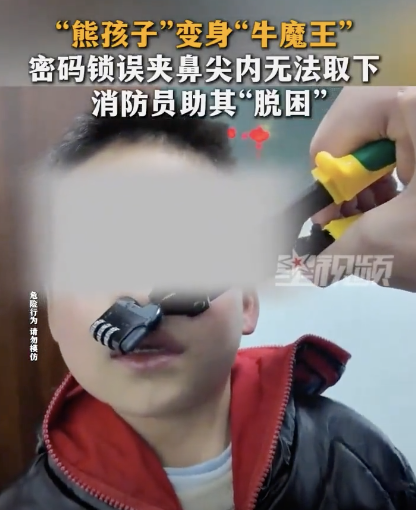 小孩用密码“锁”鼻 消防员:还玩吗?近日,湖南怀化。“熊孩子”变身牛魔王,男童将密码锁夹鼻尖内无法取下,消防员一分钟助其“脱困”。提醒家长朋友们:儿童安全无小事,家长需要时刻绷紧安全弦,小朋友们也要注意远离危险,安全第一!