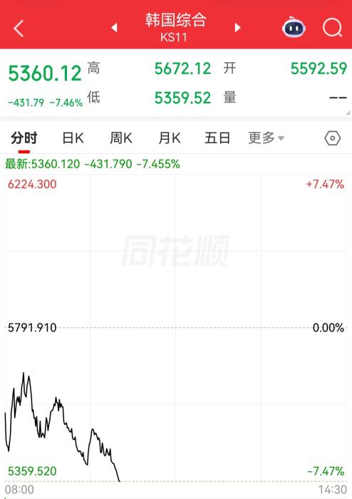 KOSPI当天低开199.32点,跌幅3.44%。开盘后,KOSPI200期货股市指数下降5%以上,触发暂停程序化交易的“临时停牌”(Sidecar)机制,这是韩国股市连续两天启动该机制。当地时间上午11时许,KOSPI盘中跌破5400点,跌幅超7%。