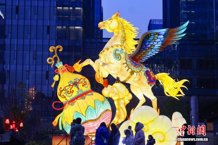 3月3日晚,江苏南京,点亮的飞马彩灯吸引民众驻足欣赏。中新社记者 泱波 摄