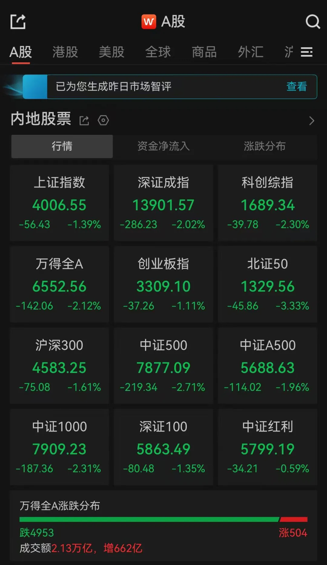 全市成交额2.13万亿,超4900只个股下跌。