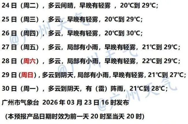 具体预报如下: - 3月24日,肇庆北部、韶关及清远北部市县多云转阴天,有分散小雨,其余市县多云间阴天,局部有零星小雨,早晚有轻雾或雾。最高气温:韶关、清远和粤东市县23至26℃,其余大部分市县26至29℃。 - 3月25日,韶关和清远市县阴天间多云,有分散小雨,其余市县多云间阴天局部有零星小雨,大部市县早晚有轻雾或雾。最高气温:韶关和清远北部市县22至25℃,南部市县28至30℃,其余大部分市县25至28℃。 - 3月26日,韶关和清远市县多云转阴天有小雨,河源及梅州北部、珠江三角洲西部、粤东市县多云间阴天,有分散性零星小雨,其余市县多云;大部市县早晚有轻雾或雾。最高气温:粤东、韶关及清远北部市县22至26℃,其余大部分市县26至29℃。