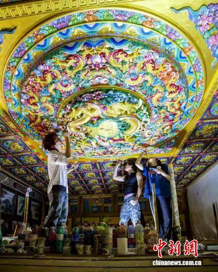 古建工匠们正仰头专注作业,用画笔为传统龙纹藻井添绘色彩,尽显匠心(资料图)。田兵 摄