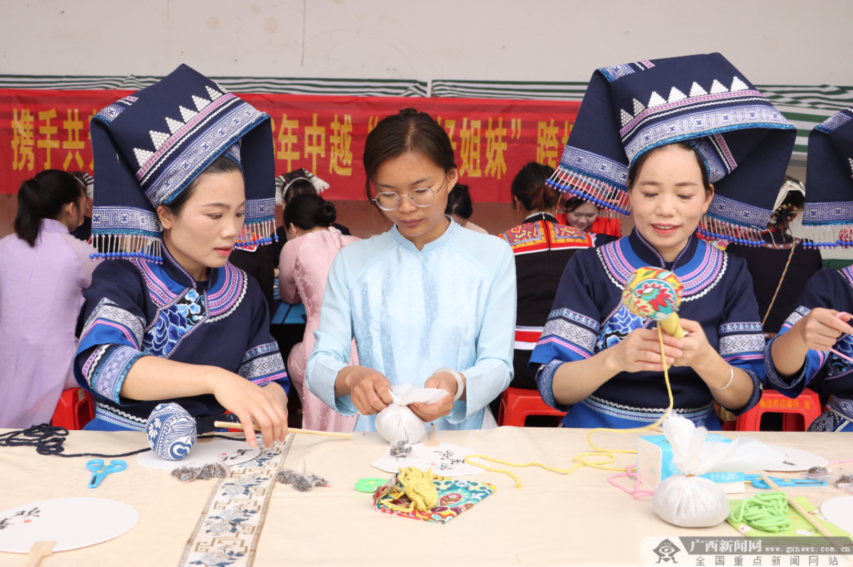 在民俗互动环节,中越姐妹携手制作传统手工艺品,一针一线间尽显两国文化交融的韵味;大家还沉浸式体验非遗技艺,亲手制作五色糯米饭、糍粑等壮族特色美食,在烟火气中拉近彼此距离。