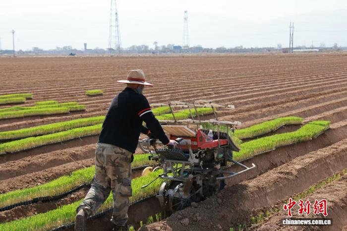 春日时节,山西省忻州市忻府区南湖村,村民们正抢抓农时,利用新技术进行葱苗移栽。张媛摄