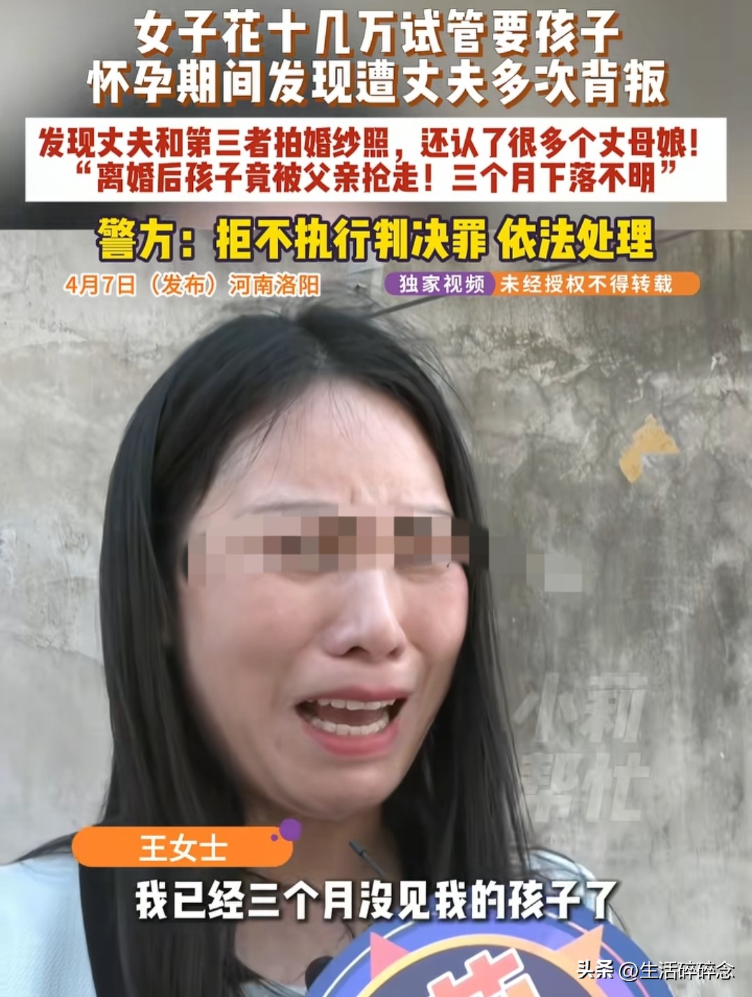 王女士母亲:“你这次结婚太不容易了,我说你就忍着点过吧,家家都有本难念的经!”王女士哭着说:“我以为他会成熟会改的,总有一天会长大的,没想到像个野人!”离婚后孩子被判给王女士,结果被孩子父亲一家3人抢走,三个月下落不明。男方家属表示:“我也很想帮你,但我一个出嫁的闺女,我能干啥。”