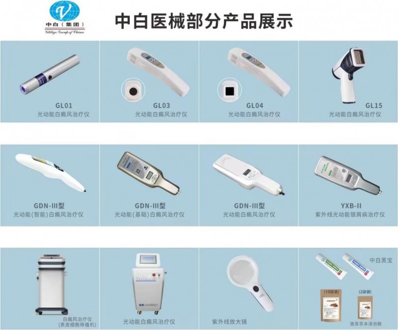 B系列白癜风治疗仪奠定了中白医械在专业医疗端的地位。解决了黑色素细胞已经消失的情况下的白癜风治疗难题。而对于黑色素细胞存在的情况,用药物和光疗的治疗也是不可或缺的方法;其治疗原理可追溯到公元前1400年,古埃及人就用植物提取补骨脂素+晒太阳治疗白癜风;到20世纪40年代,人们发现长波紫外线(UVA)治疗白癜风有显著效果;80年代起,中波紫外线(UVB)成为更高效的光疗方案。其发光体也从荧光灯、高压汞灯逐步演变为氯化氙准分子灯和LED光源。中白医械从最初的长波紫外线光疗仪起步,到中波紫外线,再到多种发光方式的迭代,不断探索研究,最终推出了光动能白癜风治疗仪GL系列。该系列产品既有医院级专用设备又有经济实用的家用便携仪器。真正从院级医疗技术普及至家庭使用,让患者在家也能享受到接近医疗机构水准的治疗体验。