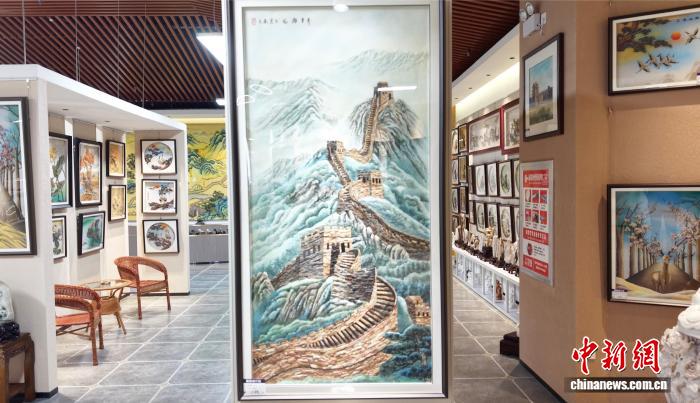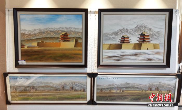 图为嘉峪关关城脚下的一文创产品基地内,由颜色各异的戈壁碎石与大漠沙砾制作而成的风雨雕石艺画琳琅满目。高莹 摄