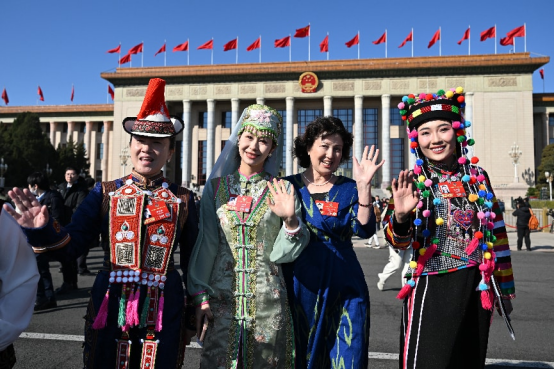 2026年3月11日,全国政协十四届四次会议在北京人民大会堂举行闭幕会。图为全国政协委员杨钰尼、木合拜尔·阿布都尔、马晓丽、贺颖春(从右至左)会后走出会场。中新社记者 赵文宇 摄