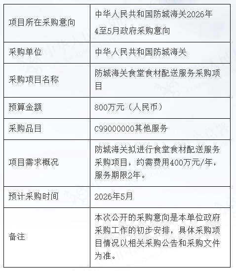 防城海关2026年4至5月政府采购意向—防城海关食堂食材配送服务采购项目