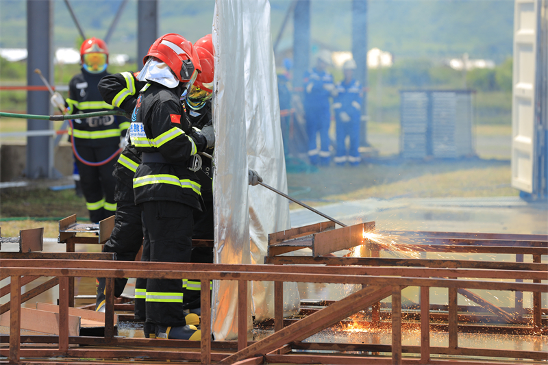 本次演练紧扣翠鸟油田投产攻坚的关键节点,全程依托中国海油井控中心为油田配套建设的井控基地开展。该基地是中国海油在非洲建设的首个井控应急保障基地,配备6大类、34台套应急装备,为演练有序推进提供硬件支撑。演练中,中乌专职救援队员分工明确、配合默契,高效完成消防管线铺设、火源围控、应急清障等科目,操作规范、衔接顺畅,充分体现中国海油在乌干达油气应急队伍的本地化建设成果。