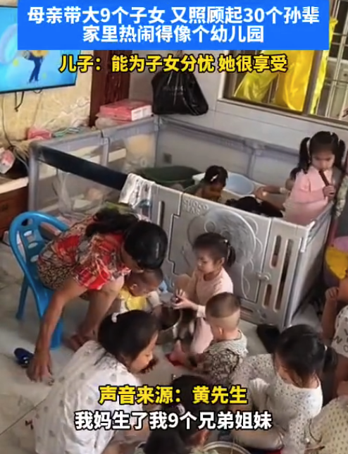 “我妈生了我9个兄弟姐妹,晚辈差不多有30个了。”在广东,一位母亲用大半生时间,将9个子女养育成人,又继续照顾起近30个孙辈。家里热闹得像幼儿园,她却说“很享受,能帮到儿女就很开心”。她的时间全都围着这个四代同堂的大家转,从不停歇。暖心故事引发网友热议,有人由衷感慨母爱伟大,撑起一个家;但也有部分网友表示不解:"9个孩子30个孙辈,老人在当代还有必要承担这么多吗?"