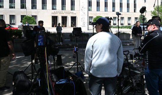 4月27日,在美国首都华盛顿,媒体记者在美国哥伦比亚特区联邦地区法院附近守候。新华社记者李睿摄