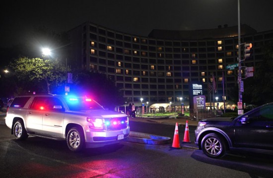 4月25日,警车停在举行白宫记者协会晚宴的美国华盛顿希尔顿酒店前。新华社记者李睿摄