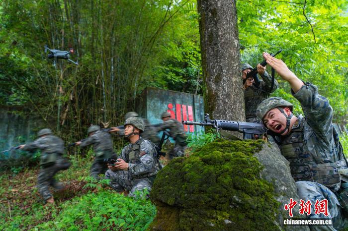 图为演训场上,武警官兵利用无人机侦察态势,同时指挥班(组)展开突击行动。施晨洲 摄
