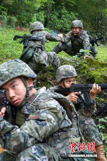 图为密林深处,武警官兵互相协助翻越障碍。施晨洲 摄