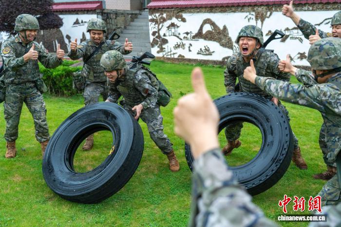 图为武警官兵正在进行翻轮胎比赛。施晨洲 摄