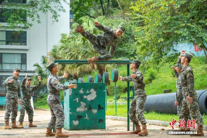 图为400米障碍场上,武警官兵依次翻越障碍。施晨洲 摄