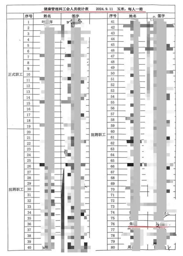 陈女士向媒体透露,朱某于2019年7月本科毕业于湖南中医药大学,同年9月入职该医院,并被安排至健康管理科。然而,朱某从未在该科室上班,实际就职于耳鼻喉科和重症医学科,却多次领取健康管理科的福利。她提供的单据显示,在“2025年春节开门红包”名单中,朱某的名字赫然在列,尽管是他人代领,签名一栏写着“代”字。此外,每逢节假日发放的米油、购物卡等福利,朱某均有份。陈女士估算,健康管理科职工每月奖金在一两万元,几年下来累计金额可能超过百万元。