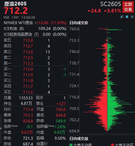 中新经纬4月3日电 (万可义)原油价格涨势不断。 北京时间4月3日,上期所原油期货主力合约大幅高开,截至发稿涨3.61%,报712.2元/桶。