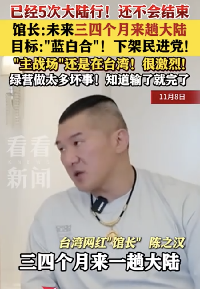馆长表示未来三四个月来一趟大陆。台湾网红“馆长”陈之汉从第五次大陆行归来后,11月8日接受媒体专访。他表示自己“未来三四个月来一趟大陆,‘主战场’还是在台湾。”并称自己的主要目标是“蓝白合”和下架民进党。“馆长”表示竞争会很激烈,因为民进党...