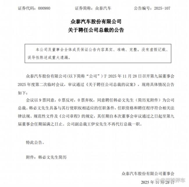 日前,众泰汽车发布公告,聘任韩必文为公司总裁,标志着核心高管团队任命工作完成。今年以来,众泰汽车密集推进化债行动、控股股东变更、董事会换届、偿债股票处置以及高管团队调整,实质上开启了一场深度且系统性的重组