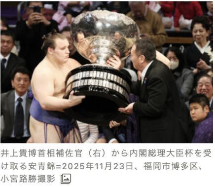 在日本福冈举行的大相扑九州场千秋乐上,内阁总理大臣杯由首相辅佐官井上贵博代为颁发,高市早苗未亲自出席授奖。日本相扑协会坚持传统规定,禁止女性进入相扑擂台,而高市早苗因出席G20峰会滞留南非未能到场