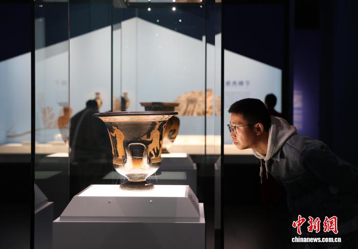 图为市民在博物馆内参观阿普利亚式红绘萼形调酒缸。中新社记者 于晶 摄 图为市民在博物馆内参观覆彩绘钟形调酒缸。中新社记者 于晶 摄
