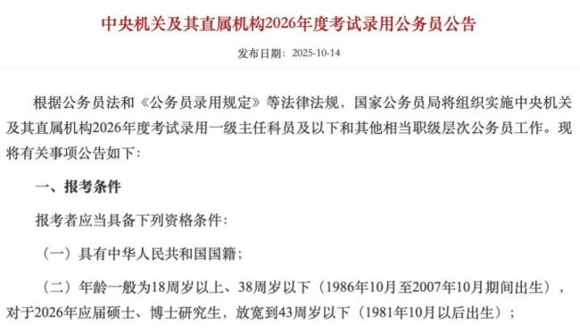 最近,国考年龄放宽的消息引发了广泛关注。根据中央机关及其直属机构2026年度考试录用公务员公告,公务员招录年龄上限由往年的35周岁调整为38周岁,对应届硕士、博士研究生,则放宽到43周岁以下。消息一出,热议不断